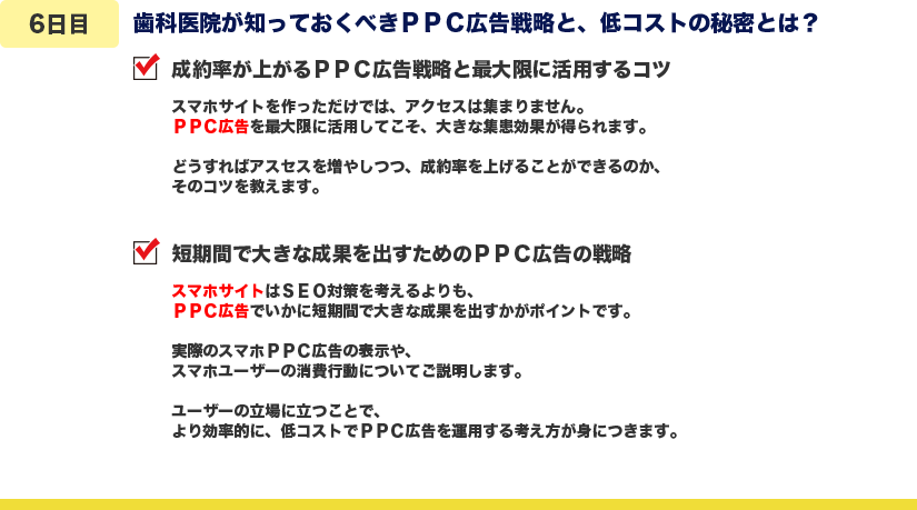 | スマホ集患メール講座 スマホ集患動画セミナー | 無料 | 歯科医院がスマートフォンで患者さんを獲得するための具体的な方法論や 実際の集患事例を、7日間のメール講座と全134分の動画セミナーでお伝えします。 |