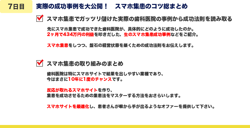 私がスマホ集患で成功したノウハウを7日間かけて、じっくりと詳しくご紹介します。
